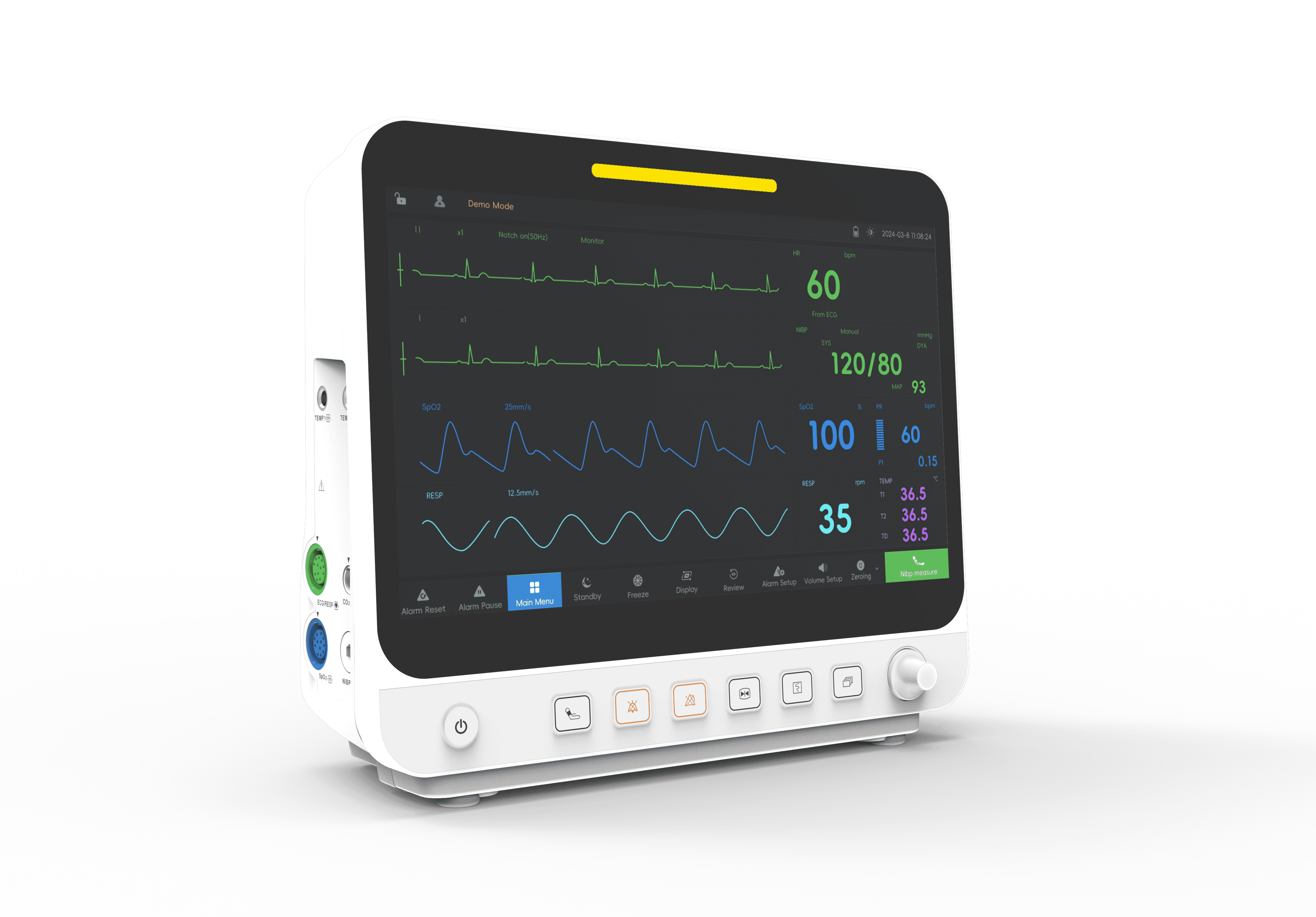 Monitorización de constantes vitales esenciales.Parámetros estándar: ECG (3/5 derivaciones), SpO₂, NIBP, RESP, TEMP, PR. Opcional: CO₂, IBP. -